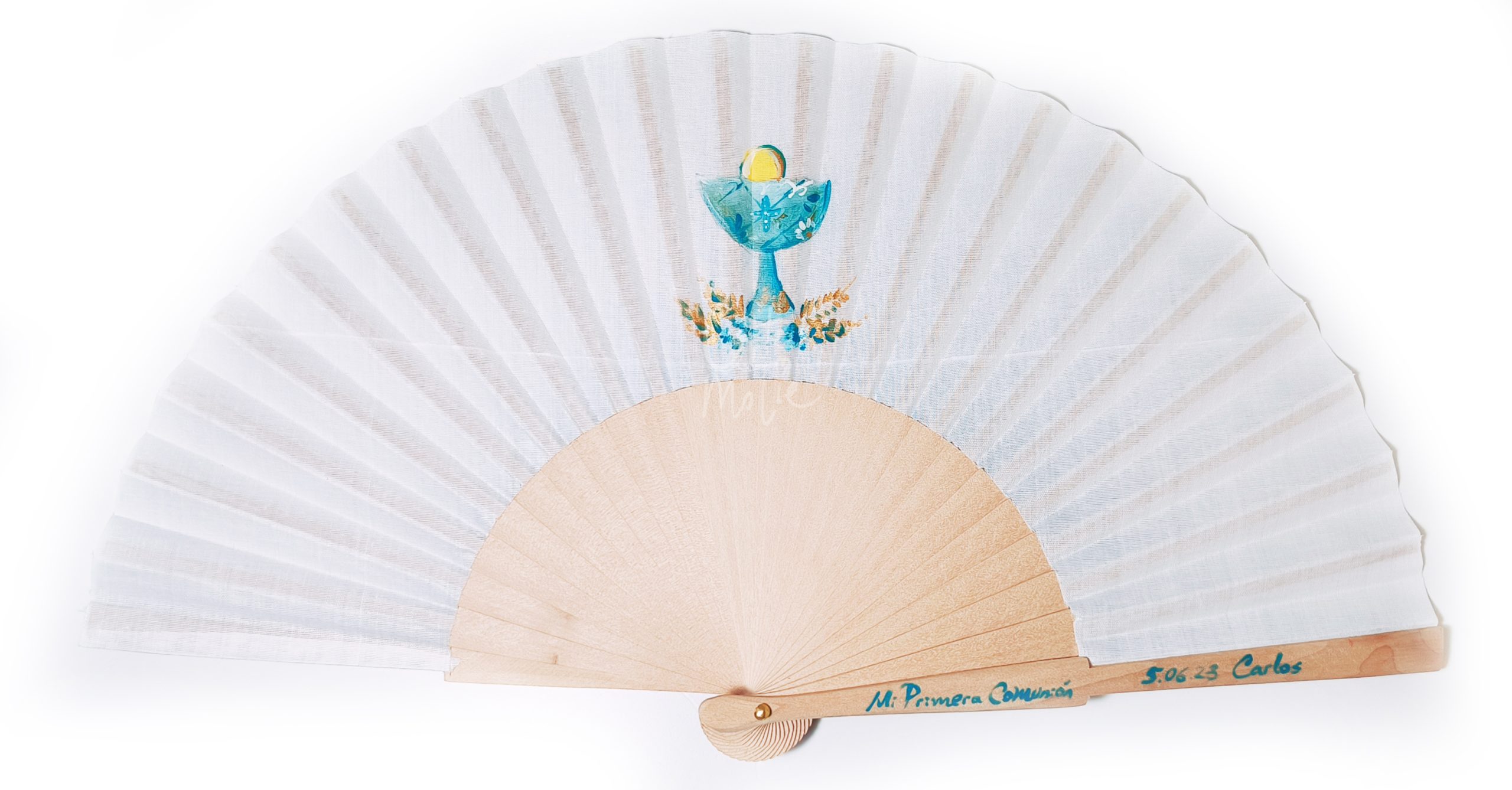 Los abanicos decorados son un detalle elegante y práctico, especialmente si la comunión se celebra en un día caluroso. Pueden decorarse con motivos religiosos, flores, encajes o cualquier otro diseño que se adapte al estilo de la celebración. Además, pueden personalizarse con el nombre del niño o niña y la fecha de la comunión.