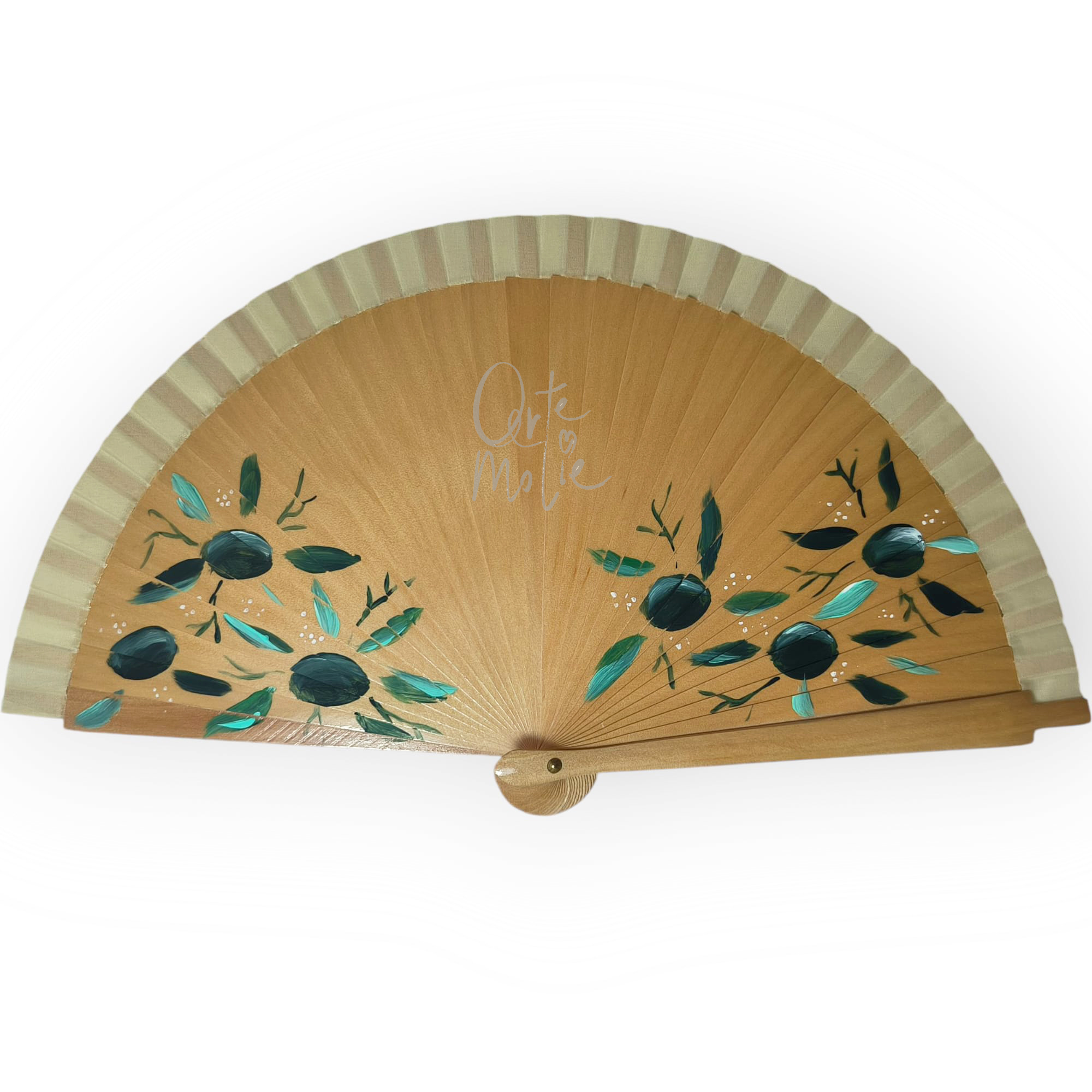 Abanico pintado a mano con diseño olivas.