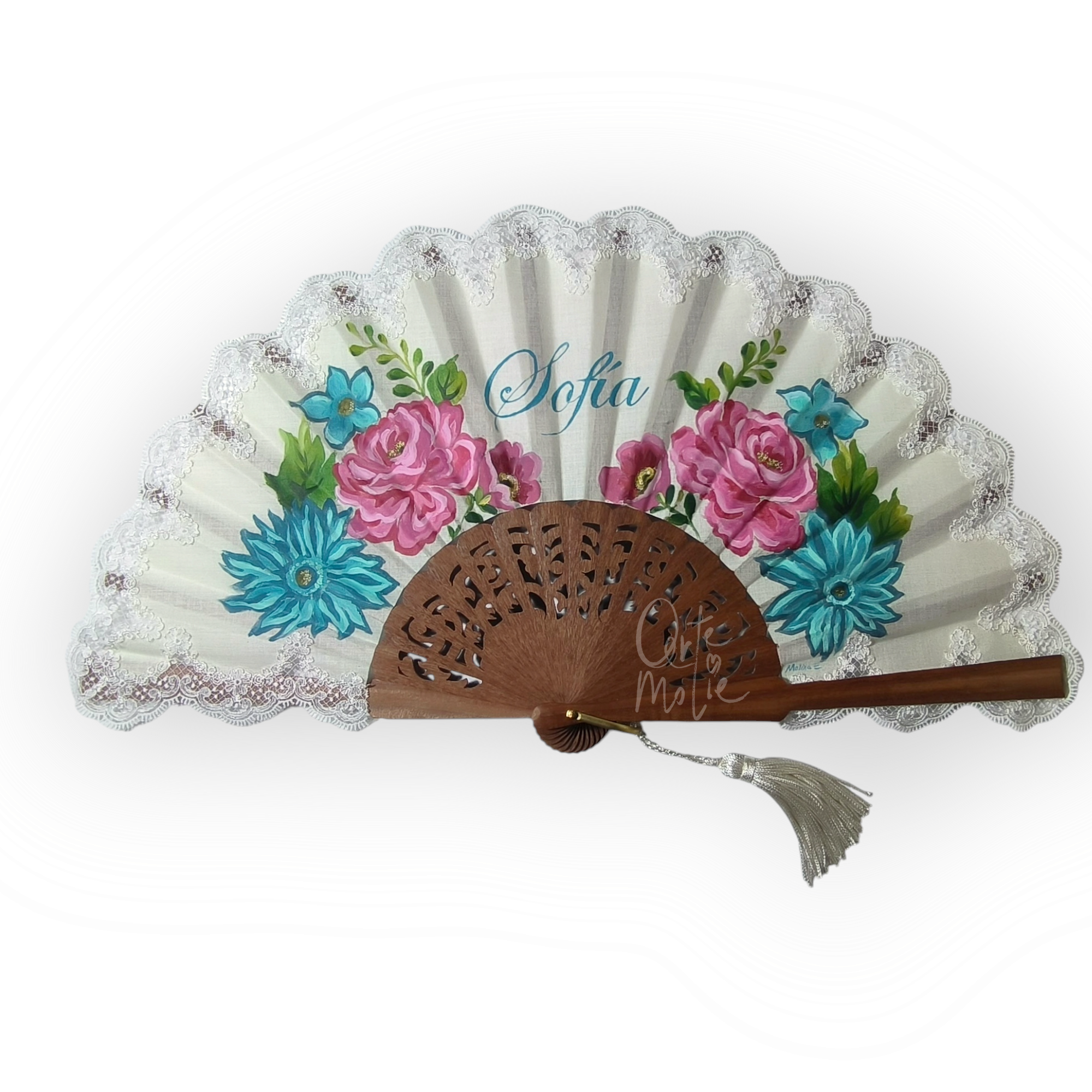 Abanico para falleras artesanal con diseño “Margaritas”. Este modelo calado en madera de bubinga y puntilla está pintado a mano y decorado con un diseño de flores y nombre . Se personaliza también con otro tipo de motivos florales . Mide 26 cm.